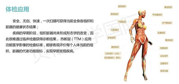 “熱斷層(TTM)技術”作為一種被動接收人體組織細胞代謝熱,以功能學為主的醫(yī)學影像設備,在醫(yī)學影像界首次實現(xiàn)了圖像自動分析,無需醫(yī)生解讀圖像,可在一分鐘內(nèi),快速提供健康檢查結(jié)果。