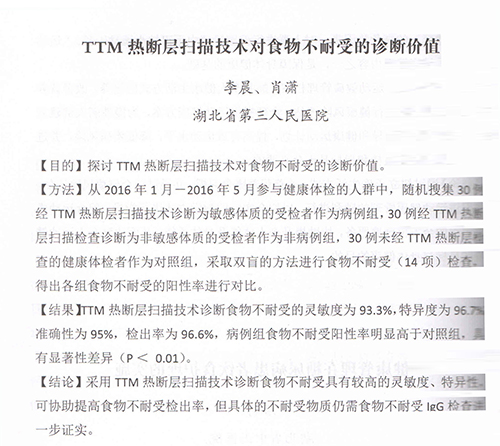 大會(huì)論文匯編收錄了湖北省第三人民醫(yī)院編寫(xiě)的《TTM熱斷層掃描技術(shù)對(duì)食物不耐受的診斷價(jià)值》,研究結(jié)果顯示采用TTM熱斷層掃描技術(shù)診斷食物不耐受具有較高的靈敏度、特異性。