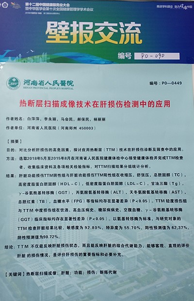 大會壁報(bào)展示了河南省人民醫(yī)院的《熱斷層掃描成像技術(shù)在肝損傷檢測中的應(yīng)用》學(xué)術(shù)論文,文章對比分析了肝損傷的高危因素,探討應(yīng)用熱斷層(TTM)技術(shù)在肝損傷診斷及篩查中的應(yīng)用,結(jié)論表明TTM不僅能反應(yīng)肝損傷狀態(tài),而且能反應(yīng)肝臟的綜合代謝能力,能夠客觀、直觀的評價肝臟的損傷情況,是評價肝損傷的重要指標(biāo)和必要補(bǔ)充。